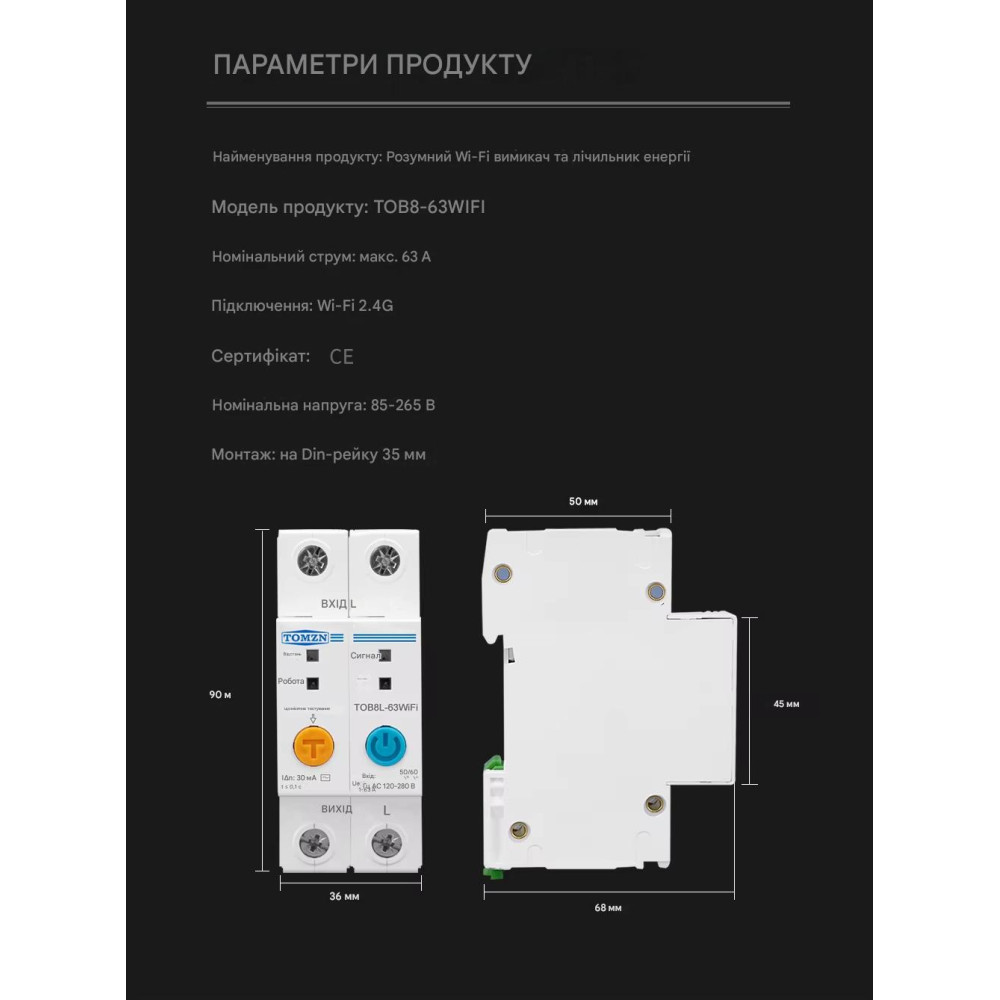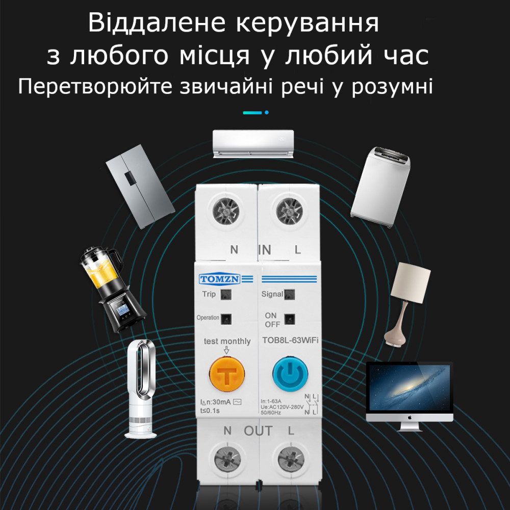 2-полюсний Wi-Fi вимикач з захистом витоків струму (ПЗО) та потужності й напруги на Din рейку, 220В до 63А Ewelink (середовище Sonoff) від TOMZN за 1245грн (код товару: SMT2 )
