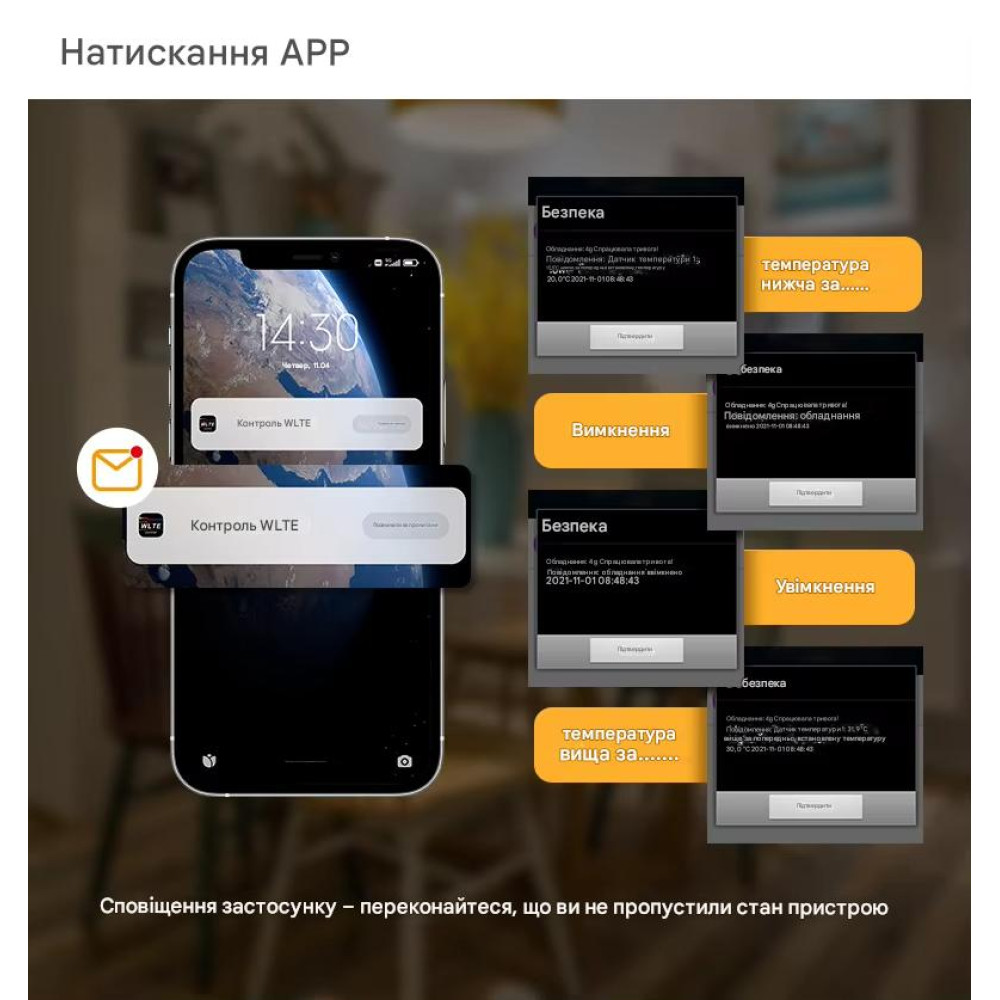 Push-сповіщення: Отримання повідомлень про зміну статусу або вихід температури за межі встановлених норм.